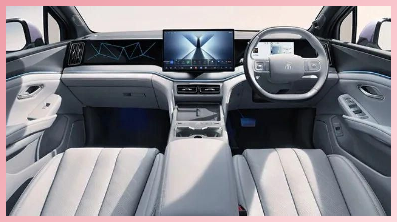 来,进车里看一下。我现在坐进来了啊。这个内饰走的是那种极简轻奢的路线,就是那种…怎么说呢,就是把那些乱七八糟的物理按键全给砍了。我个人其实还是希望能留几个实体按键的,尤其是空调,盲操起来方便嘛。然后这个皮质,是一个偏软的材质,大家听一下这个声音(用指甲敲击中控台),用料还是挺厚道的,手感非常细腻。
