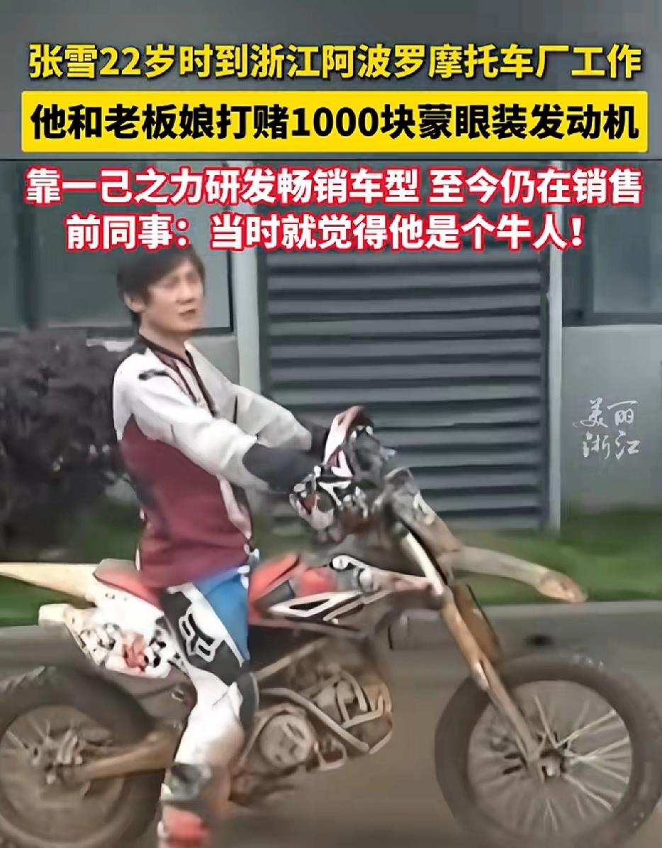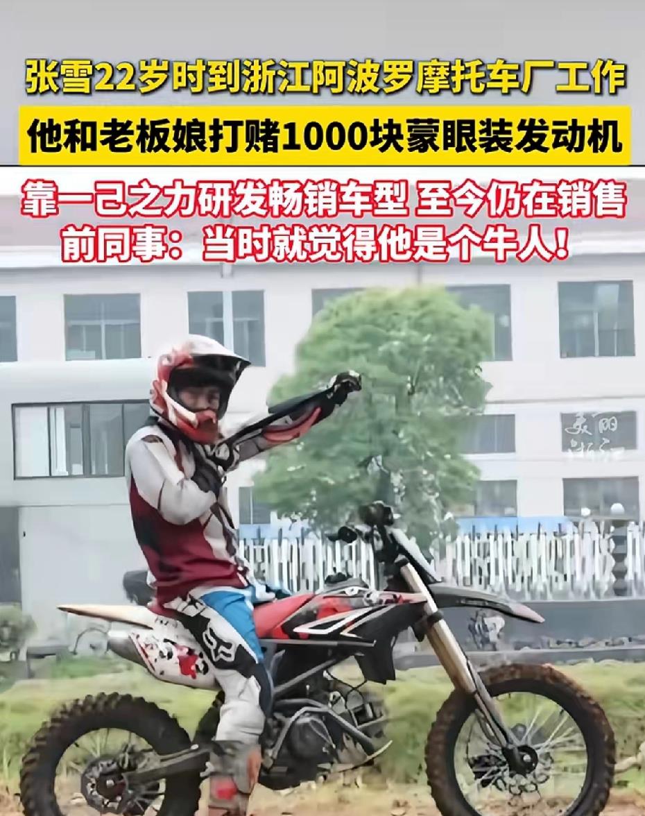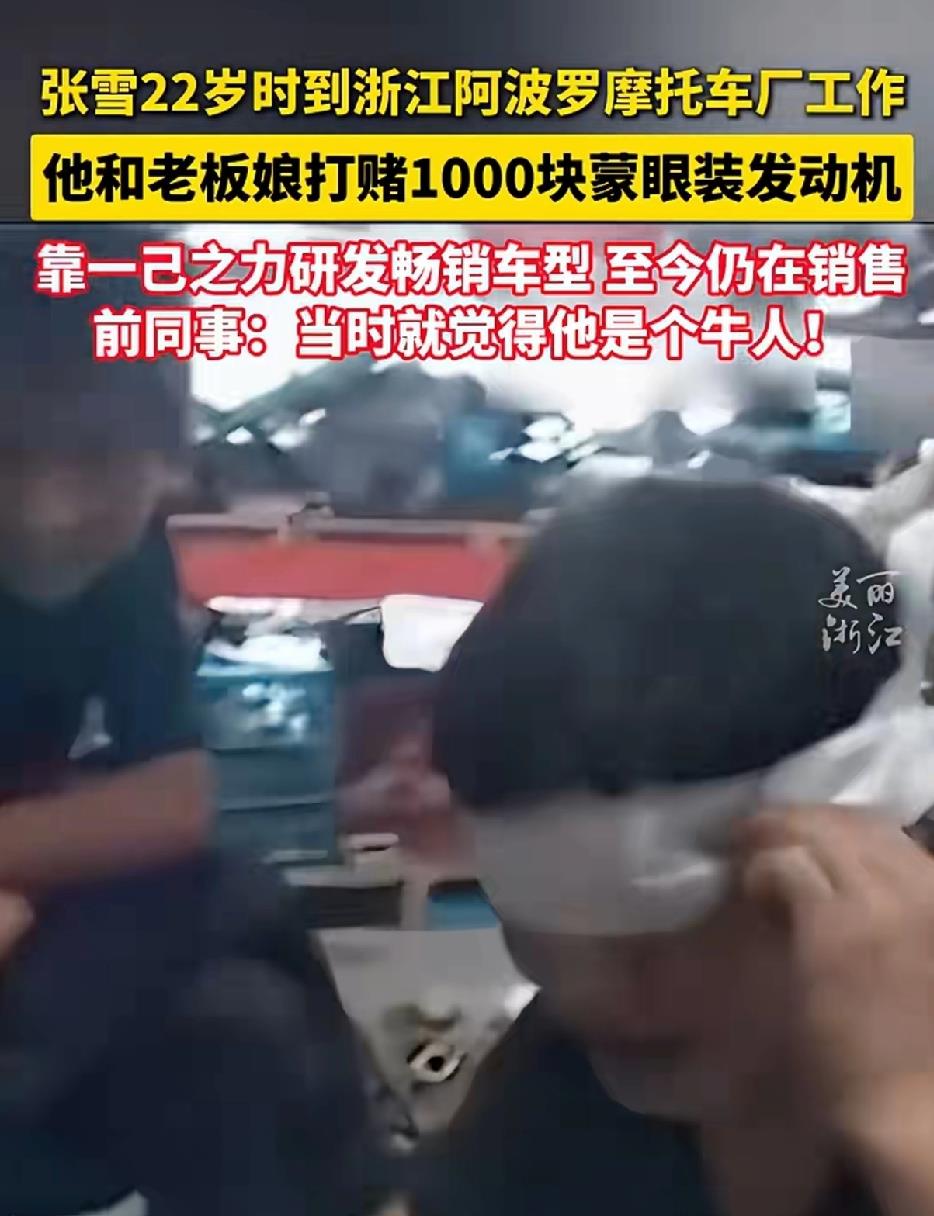 进厂后,张雪被安排在最基础的下线维修岗位。有一次,他跑去跟老板娘打赌:他能蒙着眼睛把发动机装好。应儿根本不信,这活儿干了十几二十年的老师傅都不敢打包票。结果张雪真做到了,应儿“输”给他1000块钱。