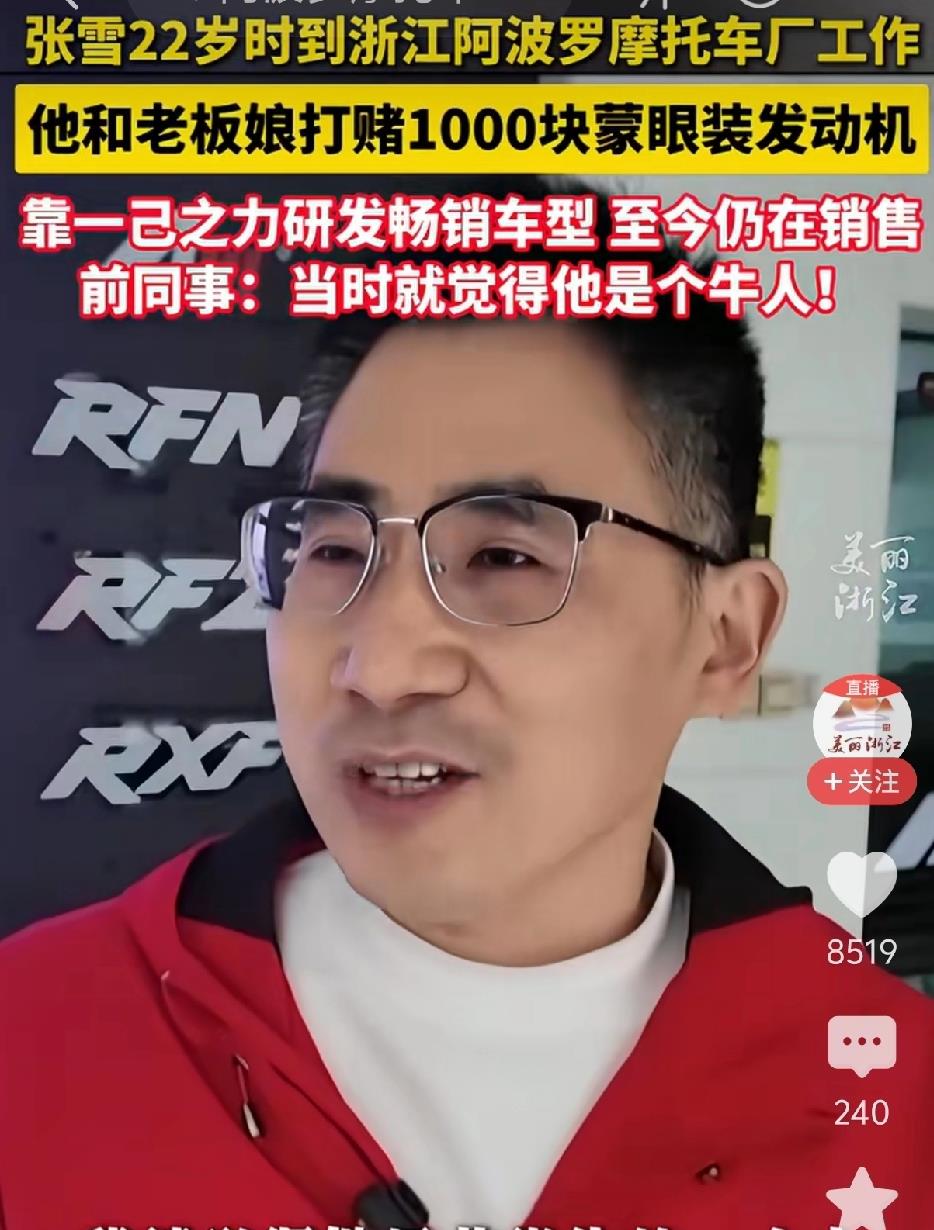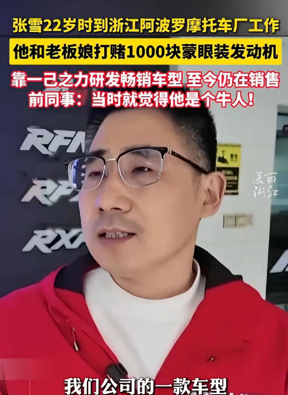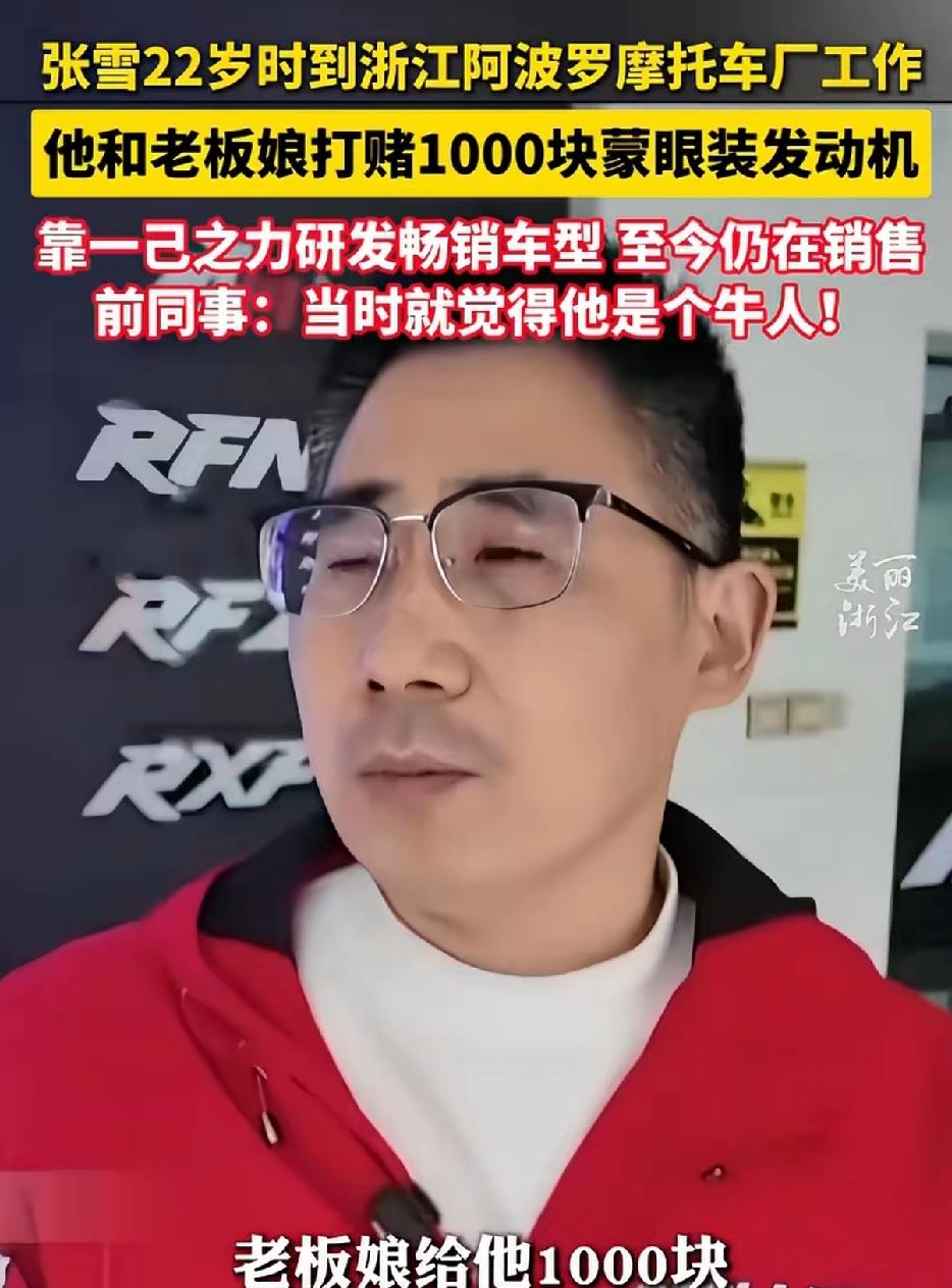 进厂后,张雪被安排在最基础的下线维修岗位。有一次,他跑去跟老板娘打赌:他能蒙着眼睛把发动机装好。应儿根本不信,这活儿干了十几二十年的老师傅都不敢打包票。结果张雪真做到了,应儿“输”给他1000块钱。