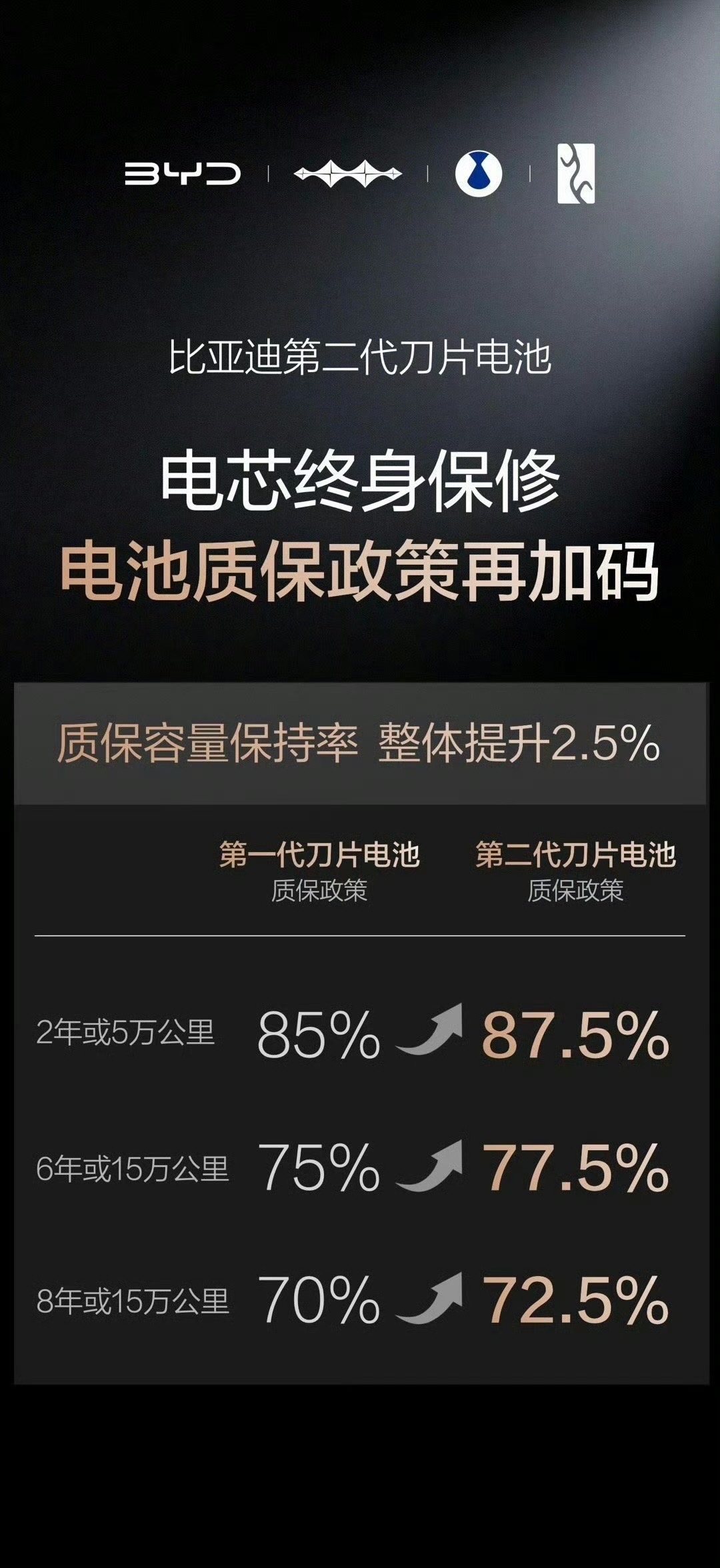 比亚迪第二代刀片电池及闪充技术,彻底打消用户两大核心顾虑,用硬核技术给出满分答案!不少人担心闪充会损伤电池、折损寿命,答案是完全不会!比亚迪打造锂离子高速通道与全温域智能热管理系统,让闪充产热少、散热快且均匀,实现闪充与长寿命兼得,第二代刀片电池寿命相较初代更优。不仅如此,电池质保政策重磅加码,容量保持率整体提升 2.5%,低于 77.5% 即可免费包换,电芯终身保修,用硬核承诺为电池寿命兜底。