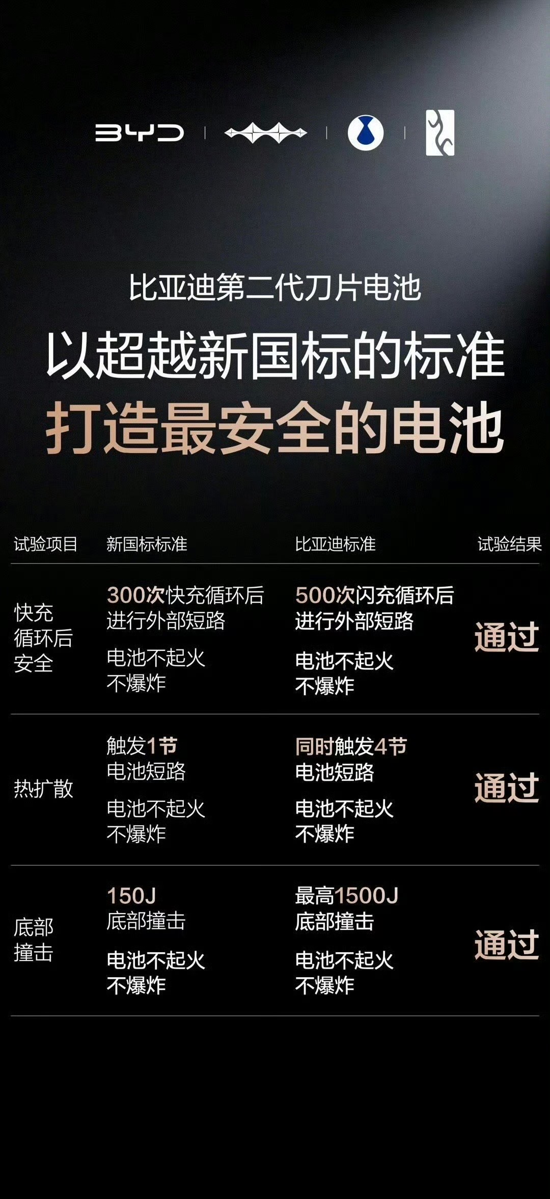 硬核闪充技术树立行业新标杆,比亚迪第二代刀片电池更实现闪充不影响电池安全,500 次闪充循环后仍通过针刺试验,热扩散、底部撞击试验均远超新国标,全生命周期安全拉满,以电池核心技术定义权,带来快充、长寿、安全的三重体验。