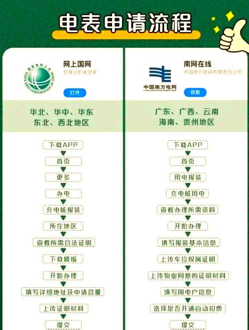 国家电网:下载“网上国网”App,完成实名注册和登录。在App中,找到“电动车”或“充电桩报装”等选项,按照提示填写相关信息,如安装地址、申请人详情、车位详情以及充电桩容量等,并上传已准备好的申请材料。