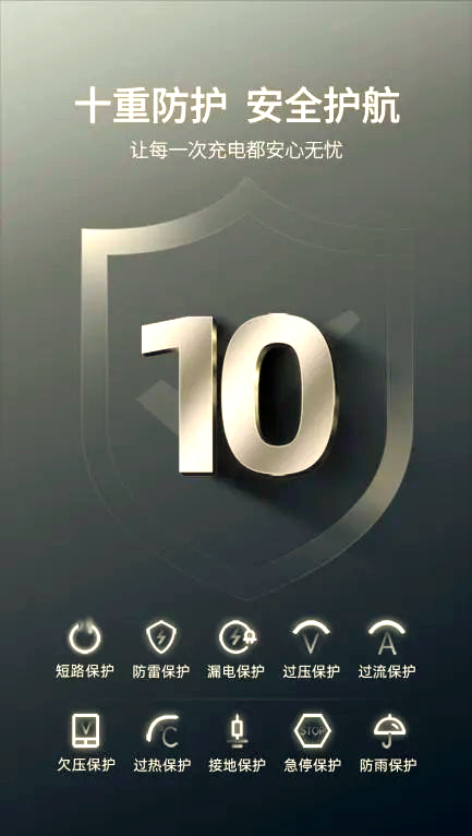 全方位守护:星云充电桩将安全置于首位,配备十重保护功能。这些功能涵盖短路、防雷、漏电、过压、过流、欠压、过热、接地、急停和防雨等各个方面,为你的爱车提供全方位的安全防护。