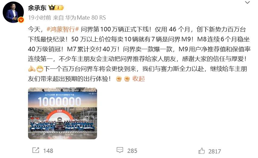 仅仅在2025年前九个月赛力斯就创造了1105.34亿的营收。而在2026年1月的时候,问界的第100万辆车也正式下线。