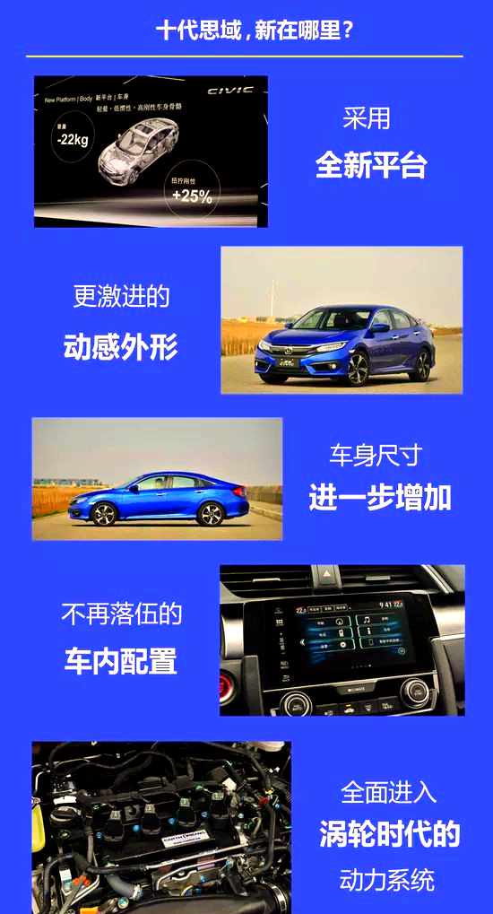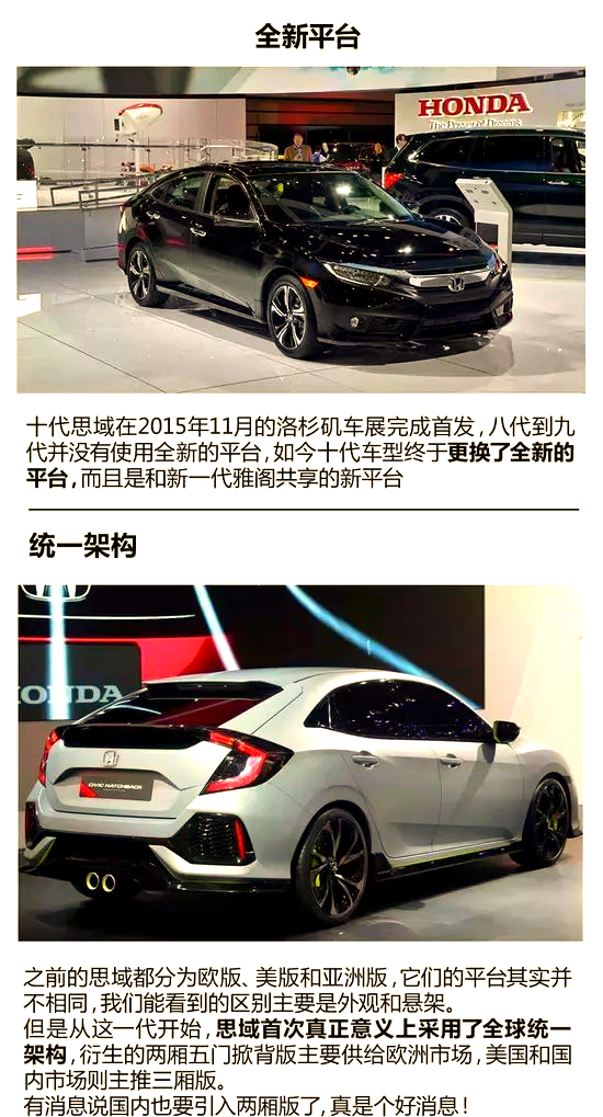 在十代思域的变革中,我们看到了许多令人瞩目的亮点。首先,新车在平台技术上实现了跨越式发展,首次采用全球统一架构,这不仅提升了思域的品牌形象,也为消费者带来了更加一致且高品质的驾驶体验。其次,在车型选择上,思域更加多样化,不仅有三厢版满足美国和国内市场的主流需求,还有两厢五门掀背版专为欧洲市场打造。这种灵活多变的产品策略,无疑增加了思域的市场竞争力。