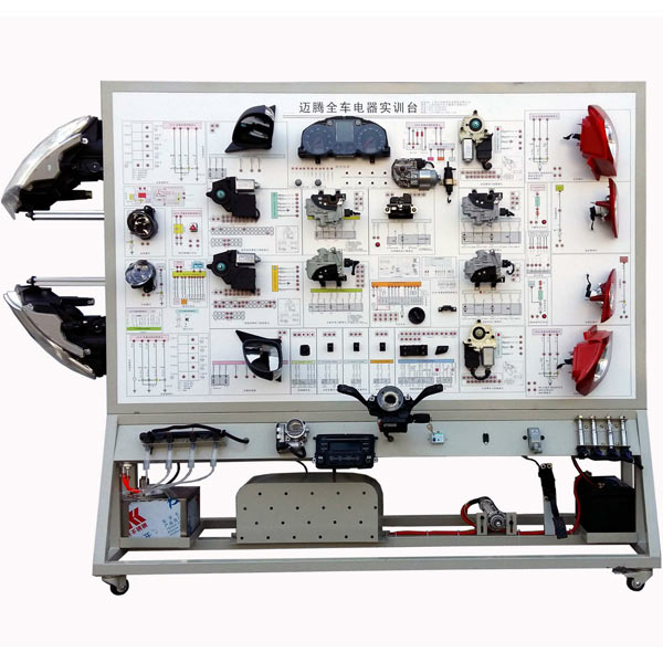该设备采用 整车电器实物为基础,充分展示汽车发动机防盗系统、仪表系统、灯光系统、雨刮系统、喇叭系统、点火系统、电动车窗系统、电动门锁、音响系统、起动系统和充电系统等汽车电器各系统的组成结构和工作过程。