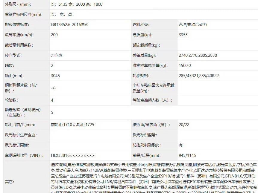 改了五座,光靠嘴说可不行,车身尺寸得跟上。新车的长宽高是5135毫米、2000毫米、1800毫米,轴距是3045毫米。咱们拿现款L8比一比,现款是5080毫米长、1995毫米宽、1800毫米高,轴距3005毫米。看出来了吧?新车长度增加了55毫米,宽度增加了5毫米,轴距拉长了40毫米。可别小看这几十毫米的加长,尤其是轴距,这直接关系到后排的腿部空间。而且申报信息里还提了个细节,新车的前悬(前轮中心到车头最前端的距离)是945毫米,比现款的965毫米缩短了20毫米。前悬缩短,通常意味着可以把更多的车身长度让给乘员舱,工程师在偷空间这方面是下了功夫的。所以,虽然车长只加了55毫米,但轴距加了40毫米,前悬还缩短了,这一加一减,实际给后排乘客带来的腿部空间增长,可能远比纸面数据看起来要可观。轮胎规格也升级了,提供285/45 R21和285/40 R22两种尺寸,现款最大是21寸,现在顶配能给到22寸,视觉效果和操控稳定性理论上会更好。
