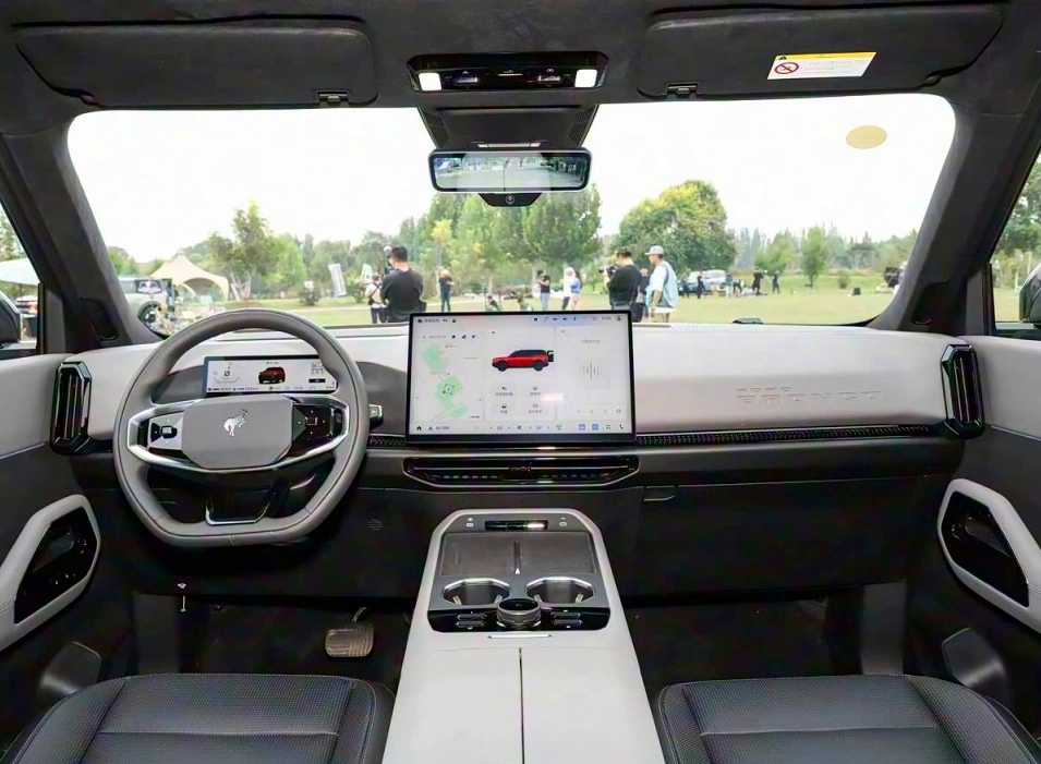 这款车的外观设计在保留烈马家族硬派基因的同时,更偏向城市使用场景。贯穿式前格栅与两侧大灯融为一体,可发光的"BRONCO"英文标识提升了辨识度。车身尺寸方面,增程版和纯电版长度均为5025mm,轴距2950mm,相比燃油版略长,但宽度有所收窄,整体造型更加精致时尚。