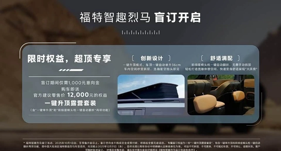 福特智趣烈马将于11月18日正式开启预售,目前已开启盲订,支付1000元意向金可获赠价值12000元的"一键升顶露营套装"。新车提供纯电和增程两种动力选择,配备高通8255座舱芯片和激光雷达,预售价区间预计在25-35万元。