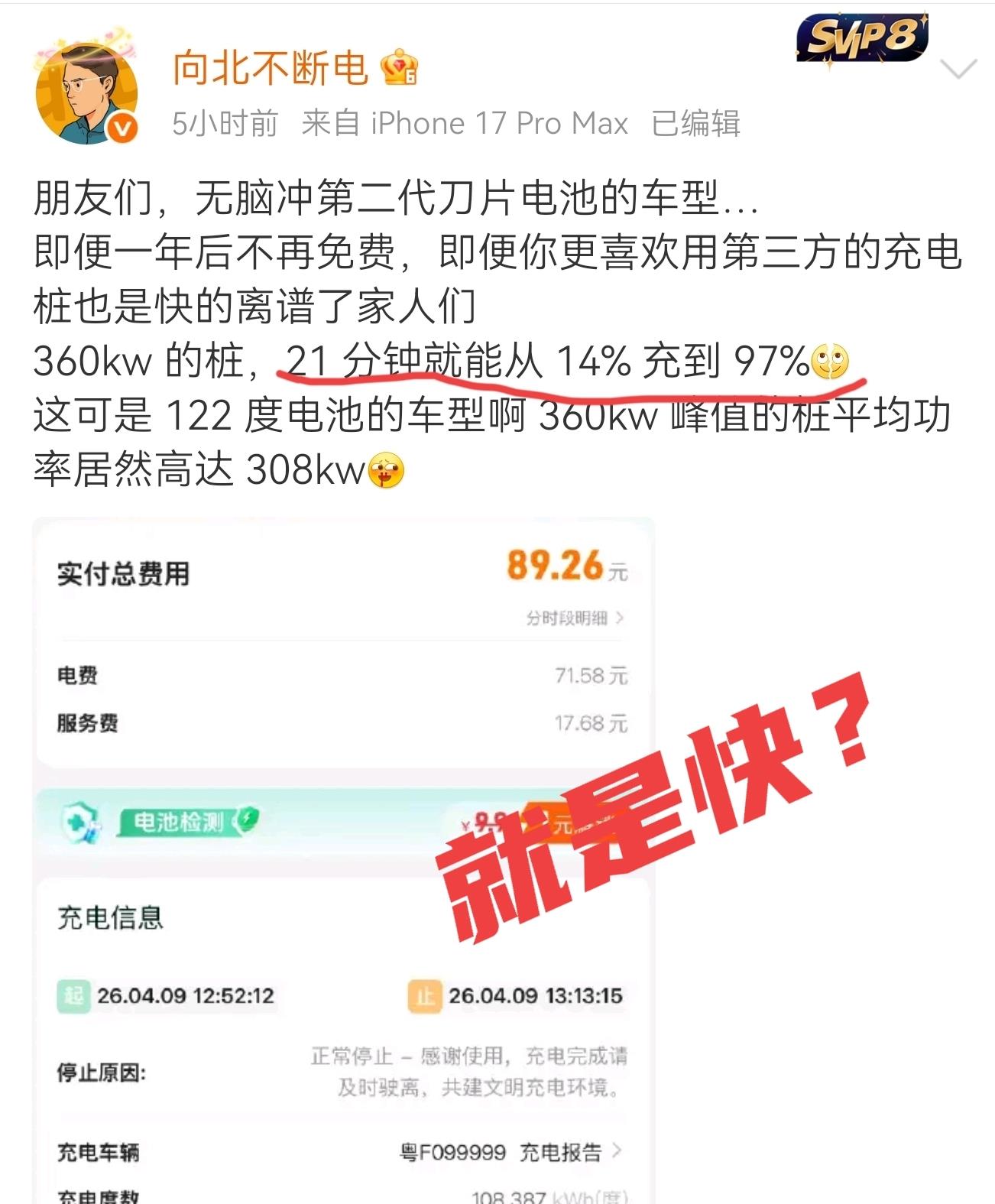 最近汽车圈有个事儿特别火,博主“向北不断电”开着一台搭载了比亚迪二代刀片电池的腾势Z9GT,找了个第三方的360kW充电桩去充电。结果数据一出来,直接把很多人看懵了。平均充电功率干到了308kW,只用了21分钟,电量就从14%飙到了97%。这个速度是什么概念呢?相当于你平时用普通快充桩充一个小时的电量,它二十来分钟就搞定了,而且用的还不是比亚迪自家的顶级设备。