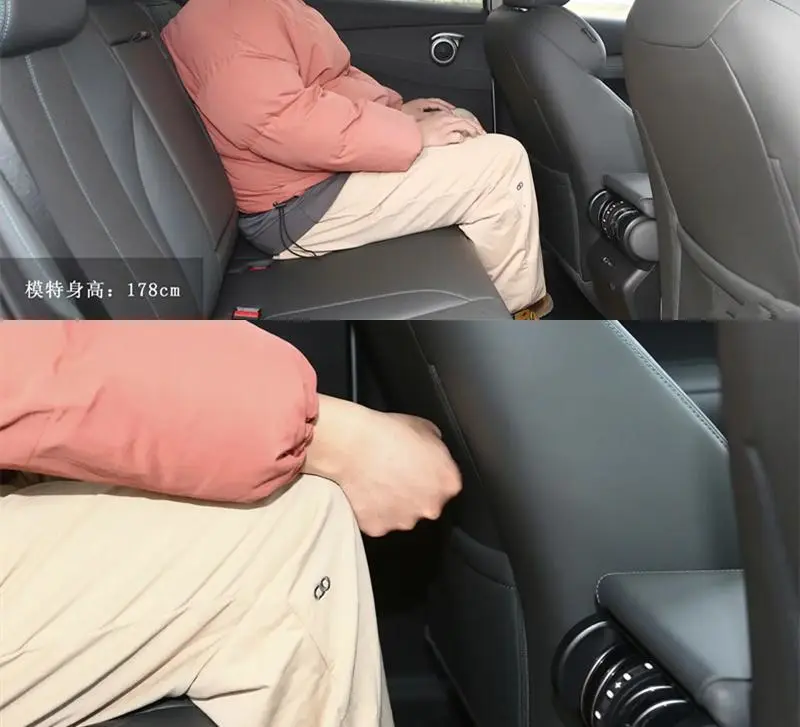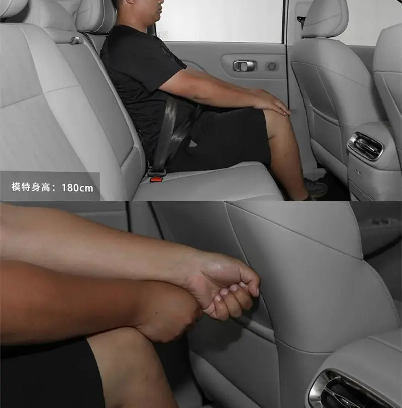 从下图上可以看到,一名男性用户坐在银河E5的后排,虽然也有两拳的空间,但是该模特的身高只有1米75,而且其身材、体型也远不如零跑B10的试驾模特。至于元PLUS,模特的身高达到了1米78,身材相对来说也更加强壮,但是坐在元PLUS的后排,膝盖距离前排座椅只有1拳的空间。