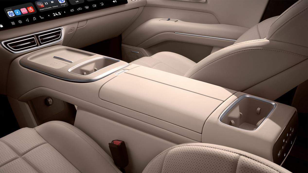 车里面有个比较有所以的配置是“一体式智能移动中岛”。正常情况下,它跟中控台是连在一起的,这个时候就是比较常见的中央扶手,提供的有手机无线充电、杯架、镂空的储物槽以及对开门的中央储物格,同时它配有滑轨,具备前后滑移功能,滑动距离能达到700毫米,也就是说它可以从前排直接移动到第二排,这样一来,第三排想拿东西也很方便。功能性上,除了作为扶手和储物槽之外,它还可以变成智能冰箱或可移动的无线充电站,遇到停车位置狭小的情况,还可以后移,让前排主副驾之间贯通,方便驾乘人员从另一边下车,甚至前后排换座也跟以前的MPV一样方便,不用再下车了。