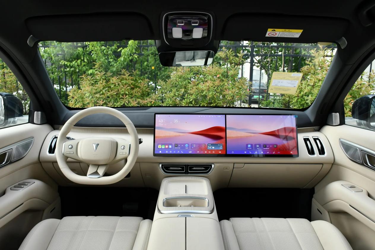 进入车内,深蓝S09的内饰呈环抱式布局。中控台设计简洁明了,车内尽可能的简化按键和旋钮,大部分功能集成于中央悬浮式双联屏里,使驾驶者能更专注于操作与路况。材质方面,车内多处采用软质包覆与细腻木纹饰板,触感舒适,整体的品质感较高。