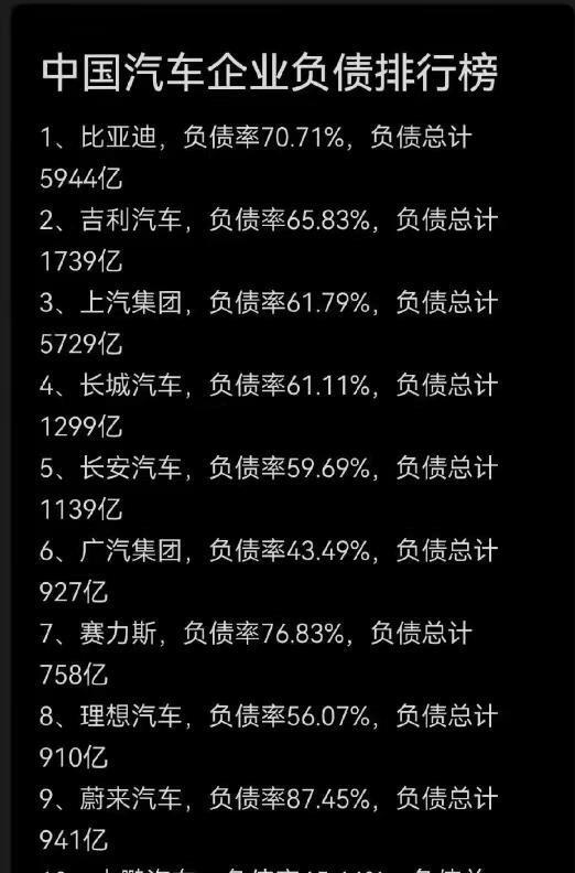 2025年各家车企的财报一出来,负债率这个数字真能把人看懵。比亚迪负债率70.75%,蔚来冲到89.79%,奇瑞更是干到了80.41%。广汽集团倒是个异类,负债率只有48.95%,全行业最低。但魏建军说的“恒大”可不是光看负债率高低,他撕开的是整个行业那层“高杠杆扩张”的皮。