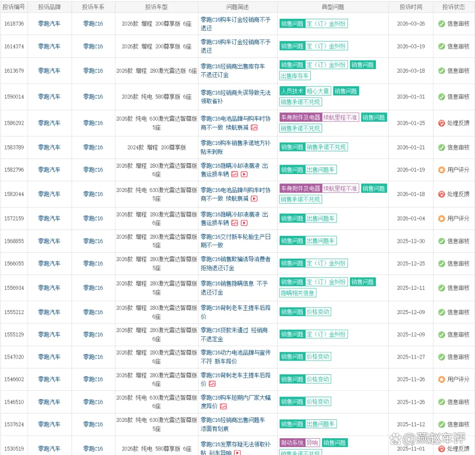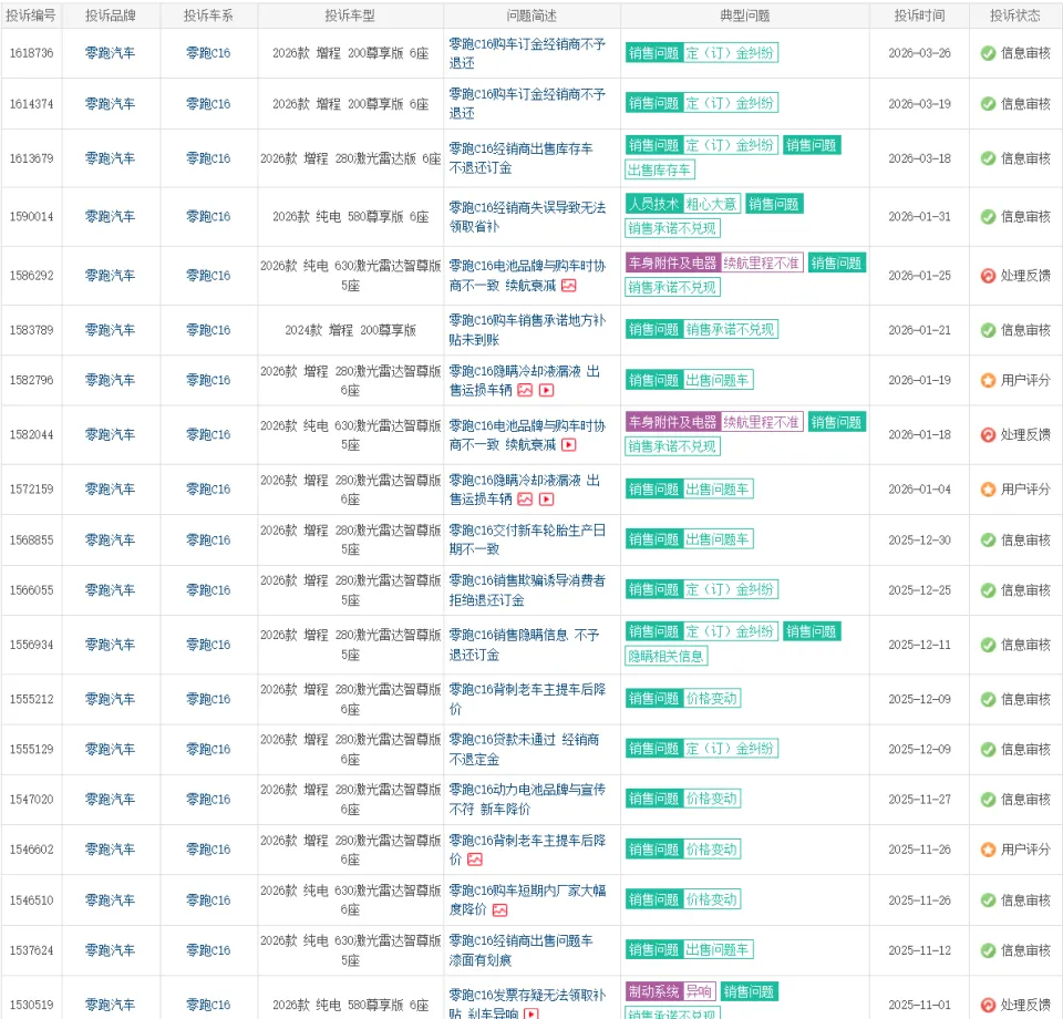 更值得关注的是,翻阅车质网历史数据可见,零跑的投诉主要集中在老车主权益与订金纠纷两方面。不少车主的诉求并非车辆故障无法维修,而是提车后遭遇降价,或是退订时遇到经销商沟通不畅的问题。这种对用户体验的忽视,对品牌口碑的影响不容忽视。