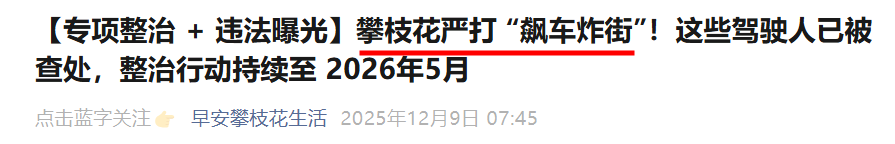 2024年12月17日起,攀枝花交警开展“飙车炸街”违法犯罪专项行动,重点整治非法改拼装、追逐竞驶、飙车炫技等行为,本次行动将持续到2025年2月。目前,交警部门已查处多起飙车炸街违法,涉事车辆被暂扣、驾驶人被拘留。