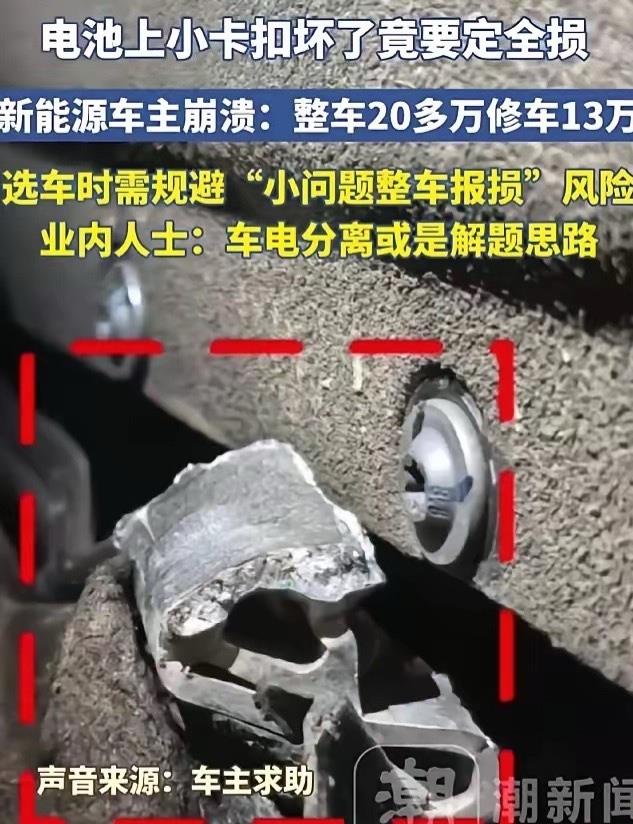 你敢信吗?一辆花了二十多万买的新能源车,才开了一个月,就因为底盘磕了一下,电池包外壳上一个塑料卡扣裂了,结果厂家说修不了,要换就得连整个电池包一起换,报价13万。最后保险公司一算账,修车比车还贵,干脆直接按全损处理,赔了整车钱,车主白亏了贴膜费不说,这辆车从此就成了一台“报废车”。
