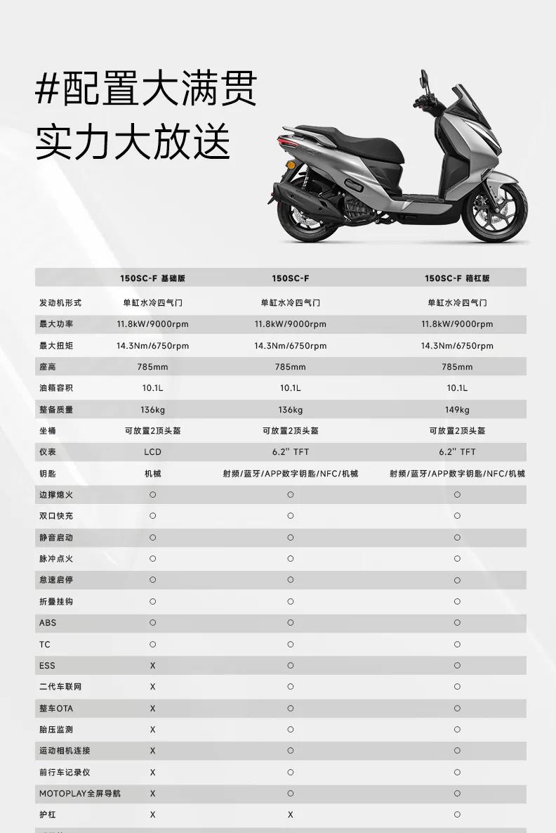 春风150平踏 SC-F 上市了,11580-13180元!我认为这是目前颜值最高的150踏板,10L的油箱也算最大了,发动机参数比本田略弱,但是不输其他的。你看本田合资给国产品牌逼成啥了?125的价格能买带前后双通道ABS+TCS的水冷150,而且还是一线大牌,也难怪万年吃老本的铃木YU125都开始降价增配了,整个市场都处于变化期,谁不变就会被淘汰,豪爵都要出四气门VVL了你想想。