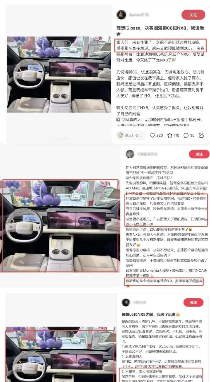 这几天车圈最热闹的事,莫过于理想汽车创始人李想在朋友圈连发好几条动态,直接开骂某日系品牌“搞黑水军”,甚至用上了“伪军”这种火药味十足的词。你没听错,就是那个当年MEGA被全网黑成那样都咬牙忍住的李想,这次居然没忍住。更戏剧性的是,他配图里晒出的证据,全是指向同一款车——东风日产刚刚上市的NX8。帖子内容长什么样呢?基本都是“20万预算,NX8 or 理想i6?”“NX8已下定,家用自驾太合适,对比理想i6后直接锁单,周末全家出游”这类模板化文案。说实话,如果你经常刷小红书或者汽车论坛,这种“二选一”的帖子你一定见过不少,但李想这次偏偏不打算忍了。