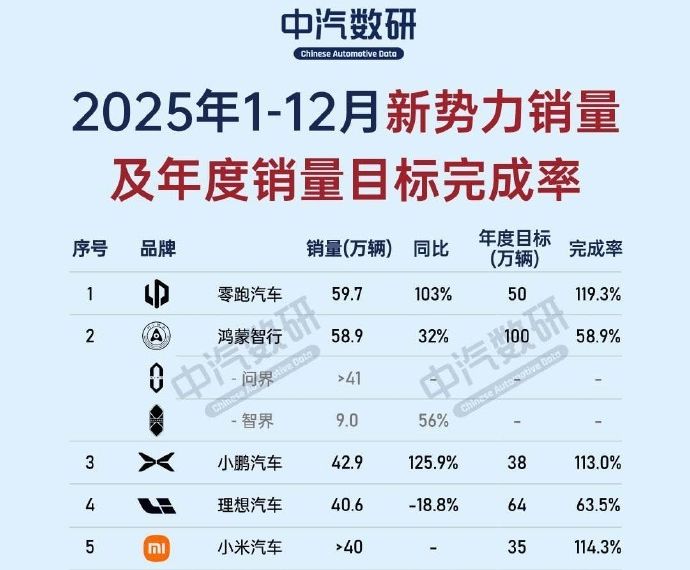 在造车新势力(零跑、理想、蔚来、小鹏、小米等)中,零跑2025年交付59.7万辆,是当之无愧的销冠。