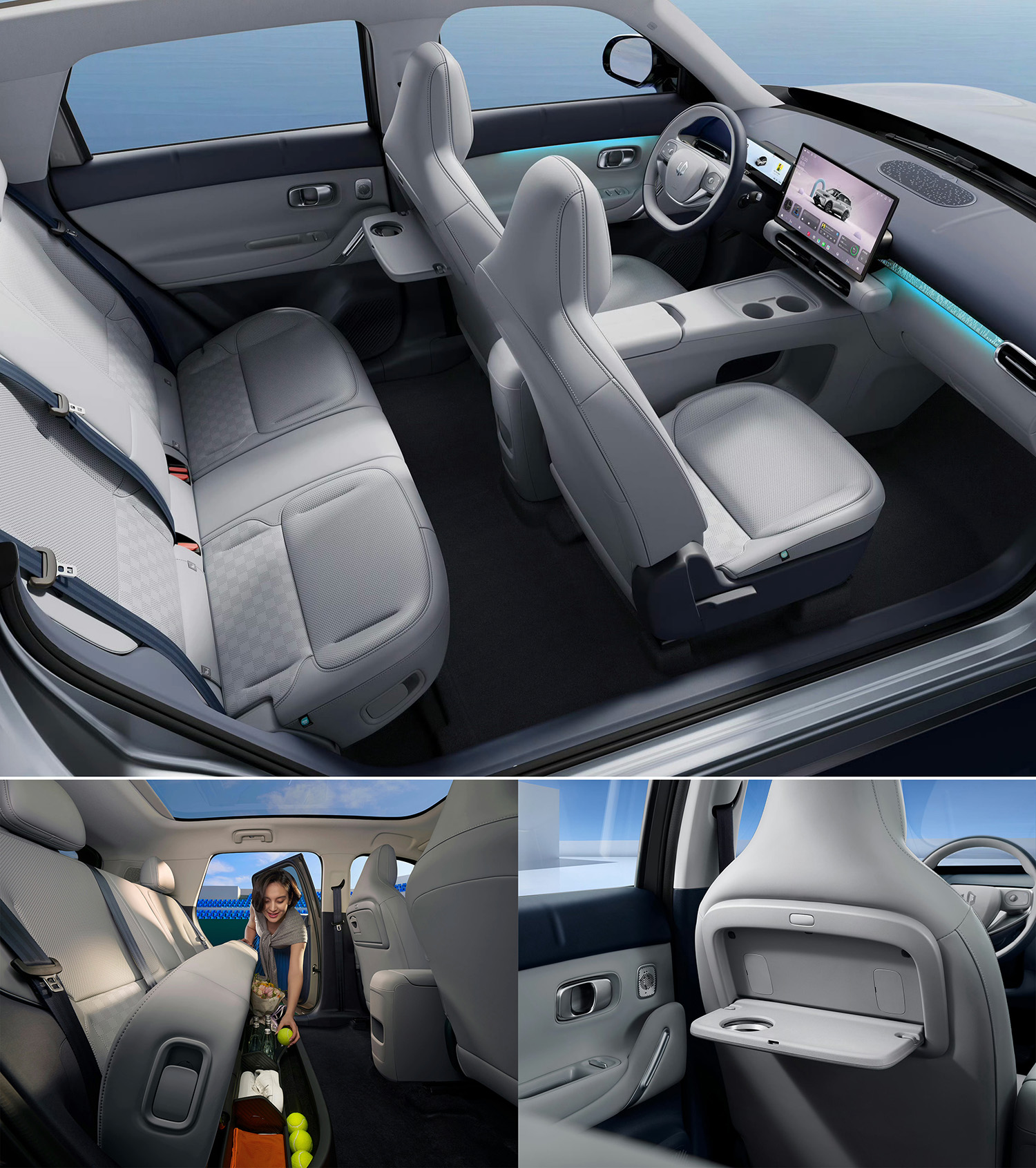 全车34处储物空间,含主驾靠背折叠小桌板和副驾90°放倒功能。