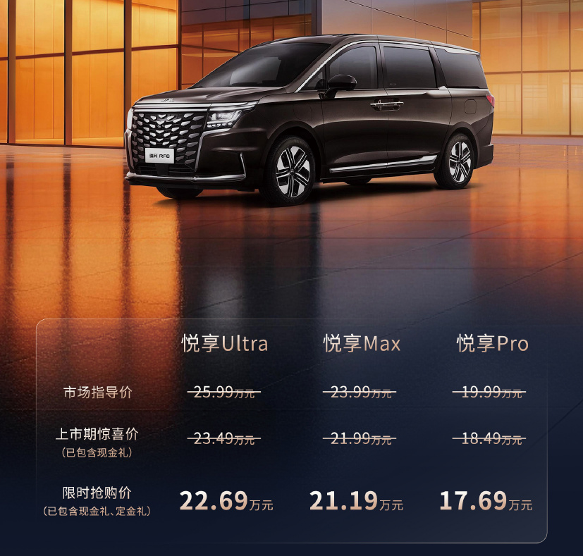 悦享系列官方指导价是19.99万至25.99万,但限时抢购期(3月10日至5月20日)直接全系砍价2.3万到2.8万不等。