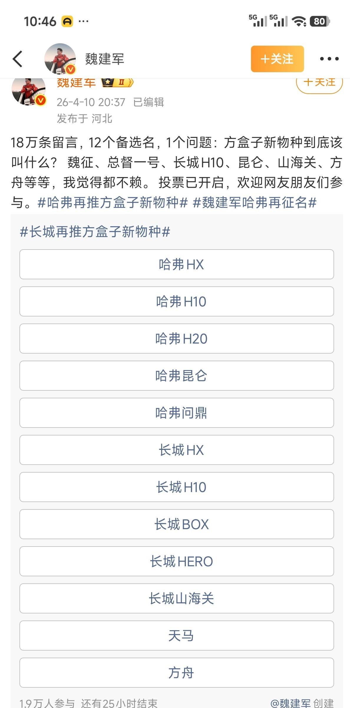最近长城哈弗这事儿,大家伙儿都瞅见了吧?魏建军亲自官宣,那台备受关注的“方盒子”旗舰,折腾了半天全球征名,又是投票又是刷屏,最后拍板的名字叫“长城H10”。从足足18万条网友留言里,先筛出12个候选,那阵仗,真叫一个锣鼓喧天。可结果呢?兜兜转转,还是回到了最熟悉的那个“H”加数字的序列里。这事儿,你说它没意思吧,它确实热闹;你说它有意思吧,结局又好像有点“意料之中”。但恰恰是这种“意料之中”,反而值得咱们掰开了、揉碎了,好好说道说道。