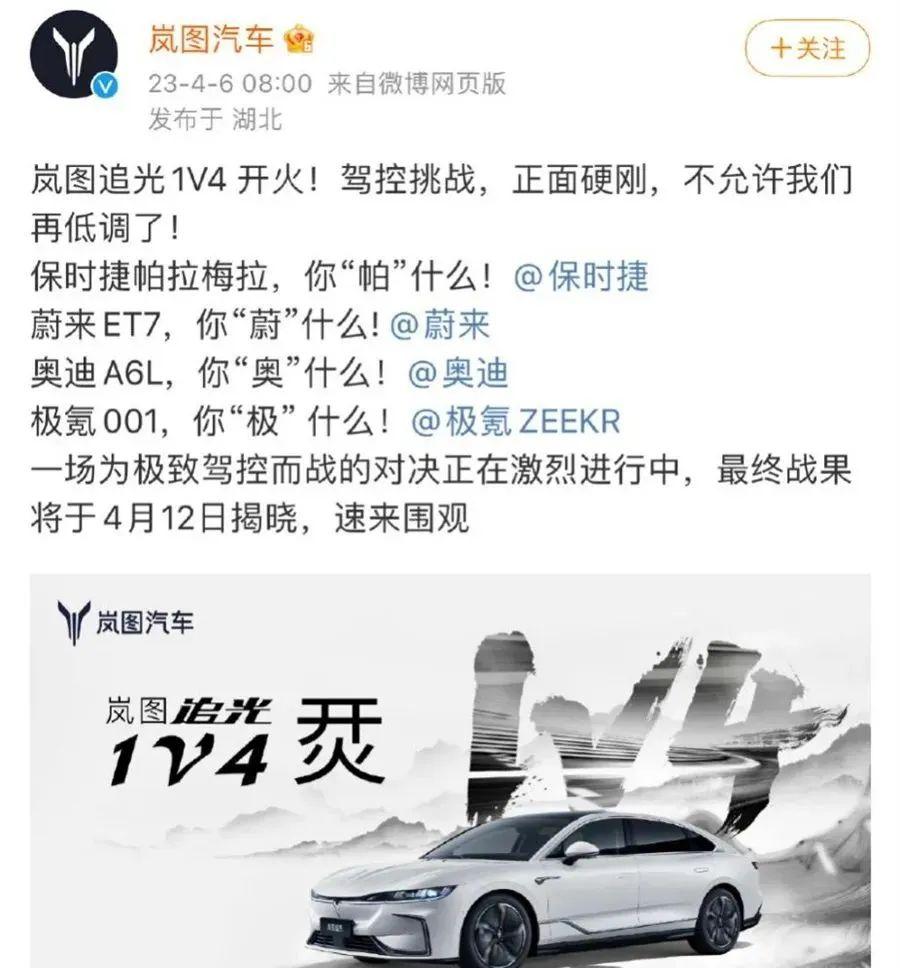 岚图这品牌,其实底子不薄。背靠东风,汽车底层研发该有的也有。不过说实话,早年宣传翻过车。当年那个1V4驾控挑战,直接喊话保时捷帕拉梅拉、奥迪A6L、蔚来ET7,还有极氪001。玩谐音梗,结果效果‘一言难尽’。
