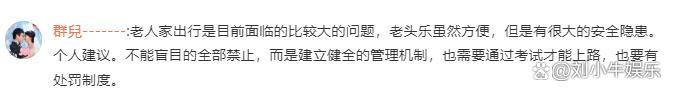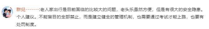 不过,也有网友持不同意见,他们认为不应一概而论,而是应该采取改进措施。例如,可以通过培训来提升老年驾驶者的安全意识,并适当调整“老头乐”(一种电动三轮车或四轮车,通常被老年人用于出行)的行驶速度,同时要求车辆上牌。