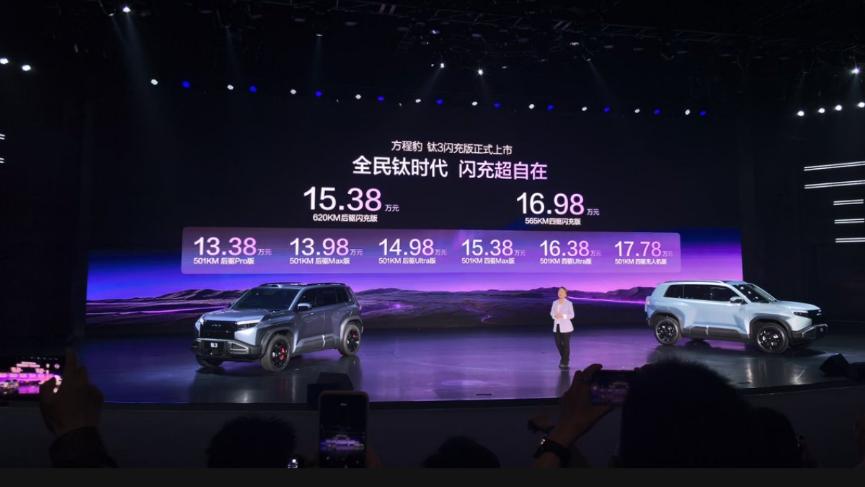 3月13日,方程豹钛3闪充版上市,推出620KM后驱闪充版、565KM四驱闪充版2个配置版本,售价15.38万元-16.98万元。活动现场,钛7EV闪充版同步开启预订,价格22万元-25万元。方程豹钛系列将成为比亚迪闪充的首个量产车型,并率先开启交付。
