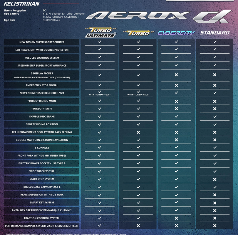 值得一提的是虽然该车是AEROX,但和NMAX NEO/TURBO一样暂时在印尼市场售卖,暂时也属于细分系列!ALPHA共4个版本:AEROX ALPHA (标准)、 Cyber City 、TURBO 、 TURBO Ultimate!