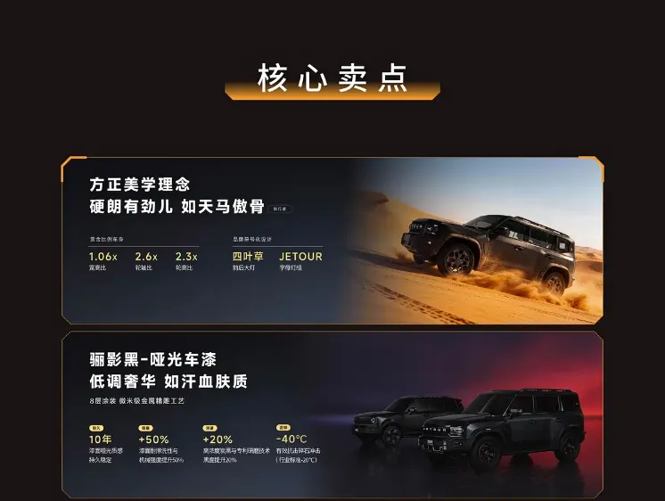 外观和配置上,骏马版的核心特色就是“马年专属+硬派实用”,辨识度拉满。外观采用方盒子硬派风格,熏黑方形一体式大灯搭配捷途英文饰板,粗壮的前保险杠尽显越野气质,专属骊影黑哑光车漆质感十足,能强化车身线条,再加上发动机舱盖的筋线、强化轮眉、脚踏板和悬浮式车顶,硬朗气场直接拉满。