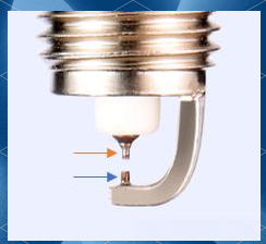 图二展示了火花塞的点火原理,其中橙色箭头所指位置为中心电极,亦被称为正极,而蓝色箭头所指位置为侧电极,亦被称为负极。当这两个电极相互作用时,便完成了火花塞的点火过程。