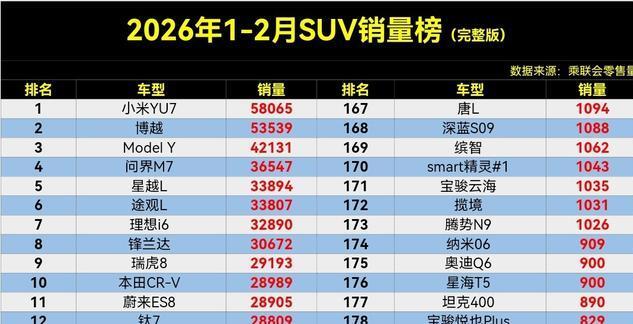 这话要是搁半年前说出来,估计没人信。但你看一眼刚出炉的2026年1-2月SUV零售销量榜,就全明白了——小米YU7直接干到了第一名,58065辆,把全场都看傻了。这可不是什么“某个月的偶然爆发”,是整整两个月的累计销量,是把第二名博越L的53539辆甩开近5000辆的差距。