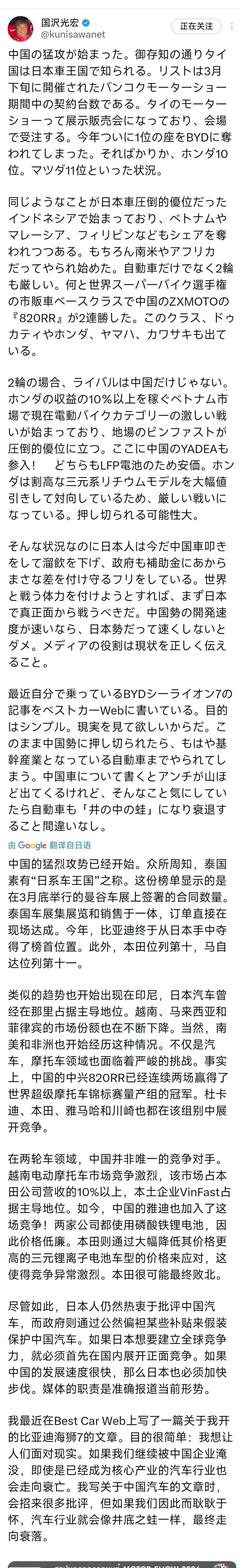 国泽光宏的文章最后写道,如果继续被中国品牌压制下去,连作为支柱产业的汽车产业也难逃被取代的命运。虽然写关于中国车的文章会招来大量反对声音,但如果一味在意这些负面反应,汽车产业势必会像“井底之蛙”一样陷入衰退。这位日本车评人的警告,听起来有些刺耳,但却是基于市场数据和亲身经历得出的结论。