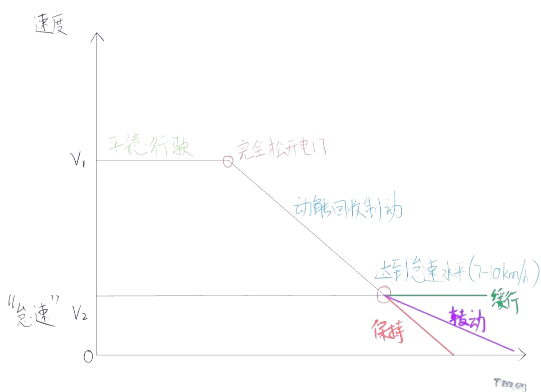 无论是“保持”、“缓行”还是“转动”模式,在松开电门后,车辆都会经历一个强动能回收阶段,且这一阶段是无法调节的。当完全松开电门时,即使未踩刹车踏板,刹车灯也会亮起,此时动能回收开始起作用。