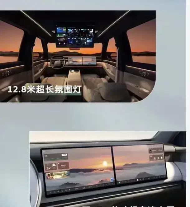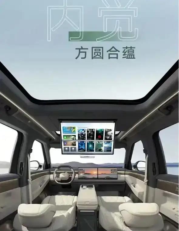 座舱内部,ID.ERA 9X玩的是“九屏联动”。前排15.6英寸中控双联屏,后排21.4英寸吸顶屏,再加上3块Smart Surface魔术屏。魔术屏这个设计挺有意思,平时隐藏在木纹内饰里,需要用时手指一划就唤醒。后排门板上的魔术屏能显示侧后方路况,下车前看一眼,能有效避免“开门杀”的风险。