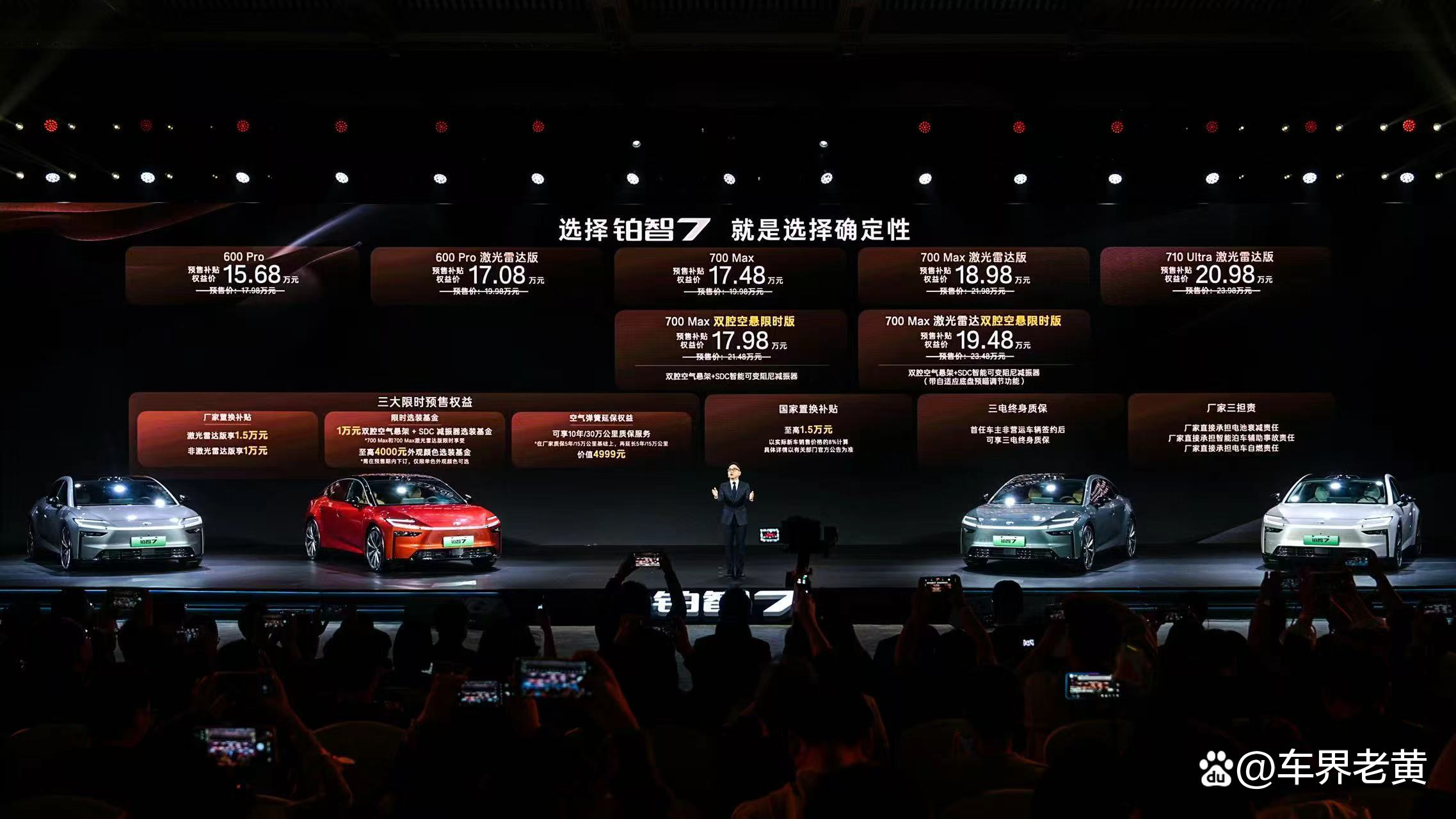 定价上,预售权益价15.68万起,主力车型700 Max激光雷达双腔空悬版限时价17.98万,顶配19.48万即可拿齐三大核心配置。