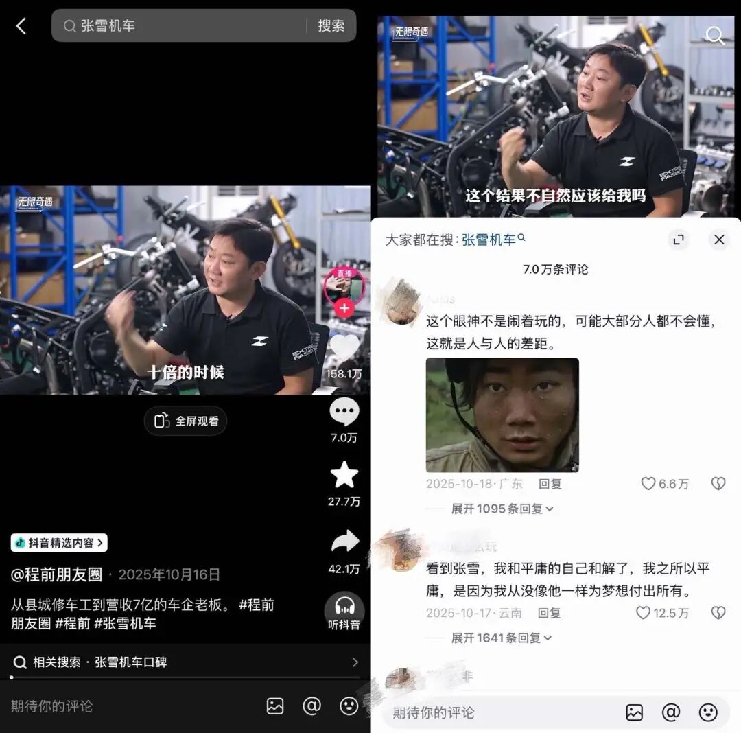 当时,评论区就有不少网友佩服张雪对梦想的坚持和执着,目前这条视频在抖音获赞超157万。
