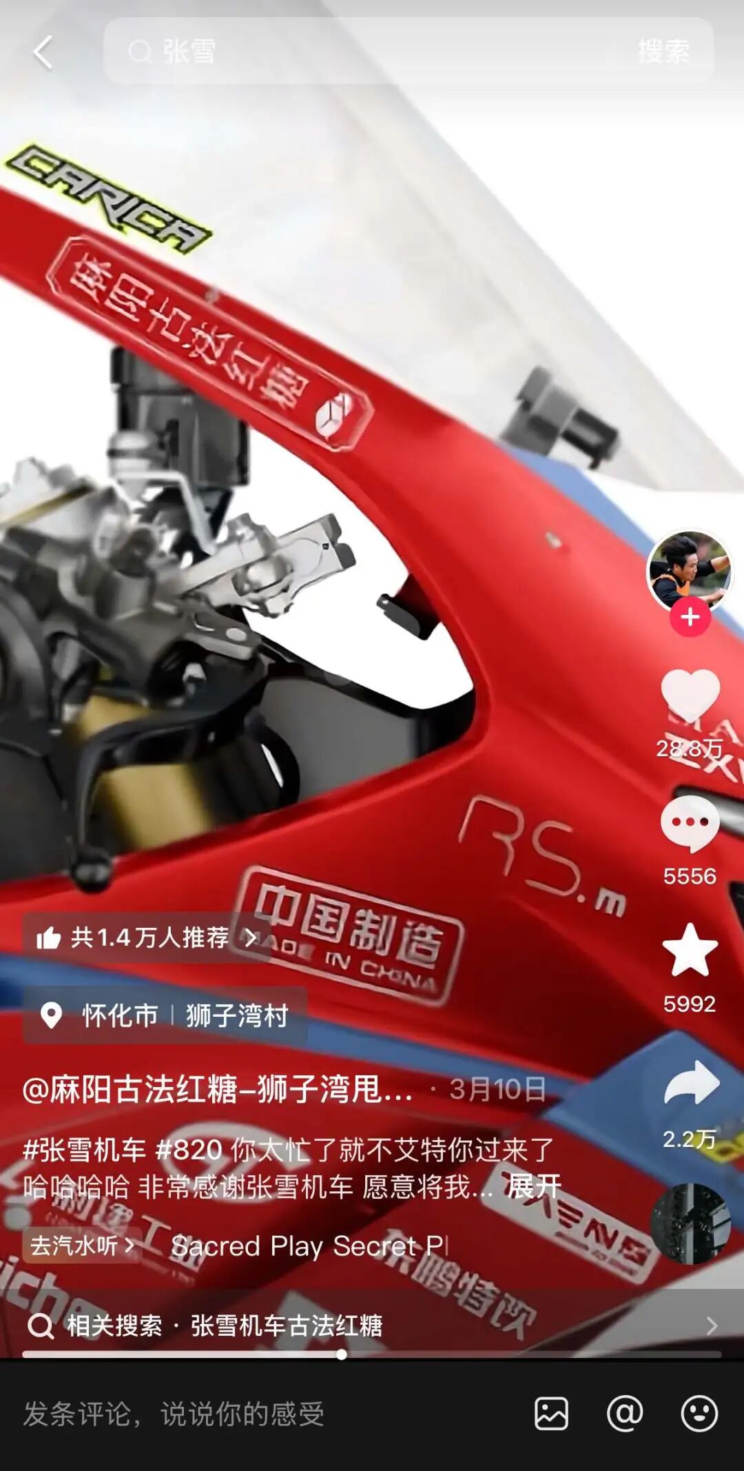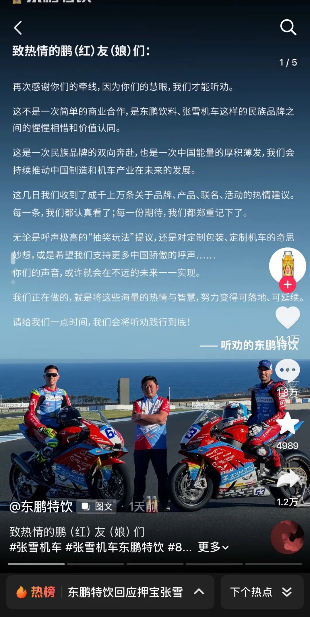 此前,张雪因征战WSBK在抖音发视频寻找赞助商,当时不少网友纷纷去东鹏特饮官方账号下评论“牵红线”促成合作。