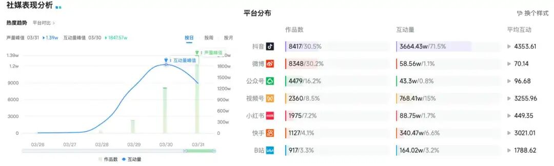 新榜旗下跨平台社媒传播监测平台“声量通”显示,从3月28日开始,“张雪机车”的讨论热度持续上升,其中抖音和微博的作品量最多,网友热议方向大多集中在摩托车、夺冠、封神等方面。