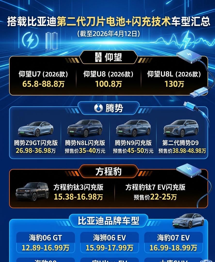 中高端市场更是密集轰炸。腾势Z9 GT纯电版,单电机370千瓦,三电机版本直接干到850千瓦。方程豹钛3,双电机375千瓦,可选装激光雷达。仰望U7 65.8万起,U8 100.8万起,U8L鼎世版130万起,全系标配闪充。从12万到130万,比亚迪这次是把所有价位段的桌子都掀了。
