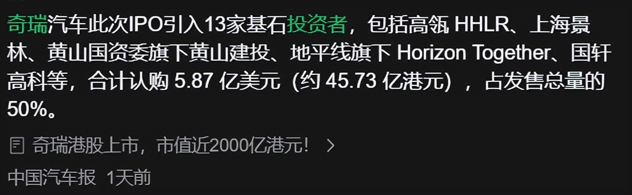 这一次,奇瑞的投资者们可以说是全明星阵容。其中,有像黄山建投这种有国资北京的机构,也有像高瓴这种知名投资机构。