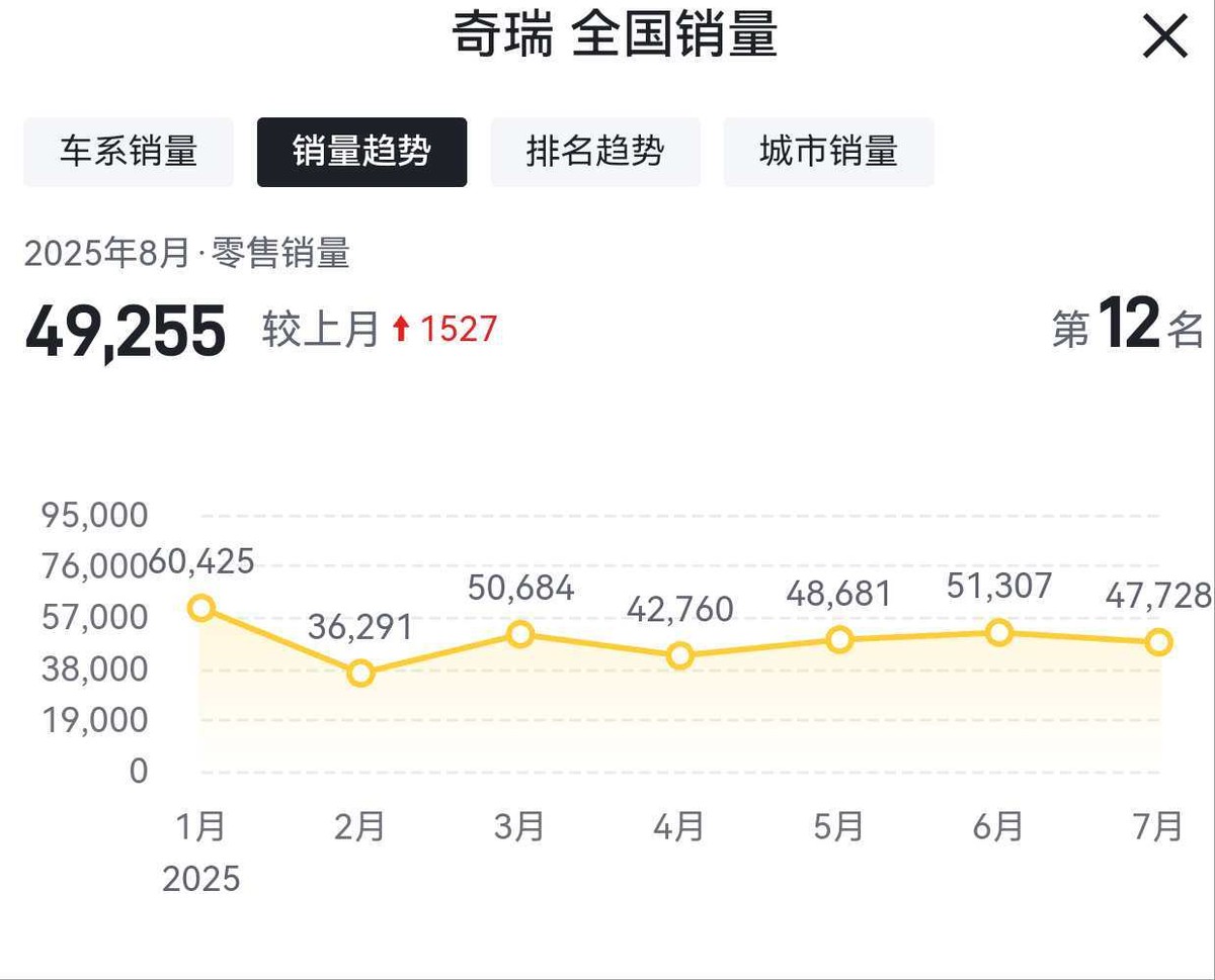 紧接着到了新能源时代,奇瑞突破了鲲鹏电池、智舱大模型等技术,旗下的新能源品牌也都获得了不错的成绩。今年以来,奇瑞的月销量平均都在5万左右。