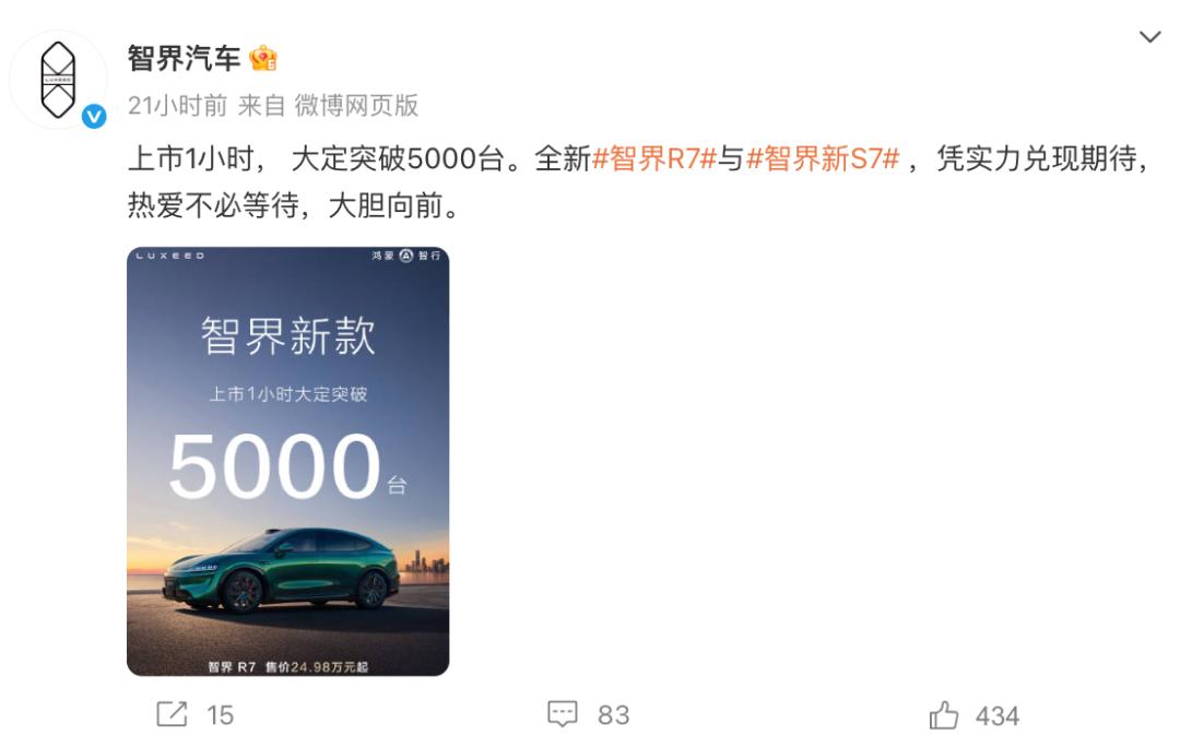 8月25日,在新款智界发布会之后的2个小时里,智界的大定超过了5000台。如今,发布会已经过了一个月,已经有车主陆陆续续交付成功了。