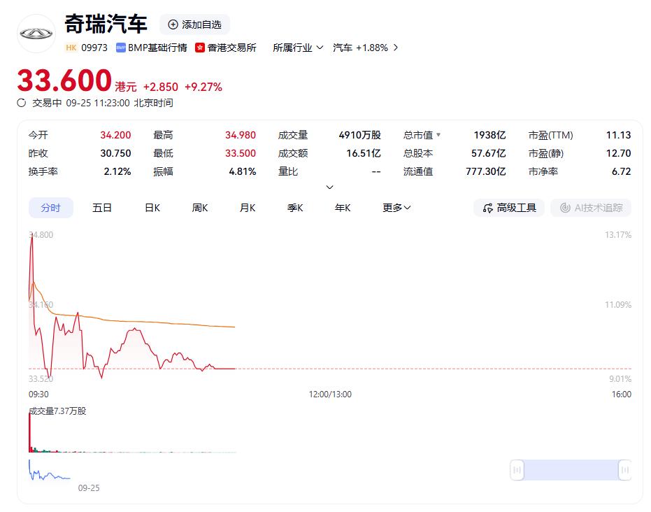 在正式挂牌之后,奇瑞的股价开盘即狂飙,股价从开盘的34.2港元一直涨到34.98港元,总市值一度超过1900亿港币。