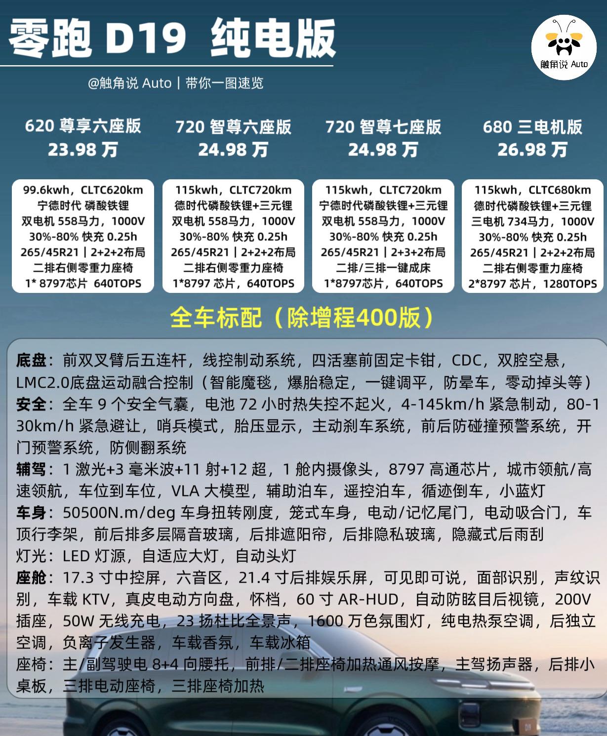 零跑D19这次一共推了7款车型,增程版3款,21.98万到23.98万;纯电版4款,23.98万到26.98万。什么概念?理想L8现在卖33万起步,问界M7也要25万往上,尺寸还都比D19小一圈。