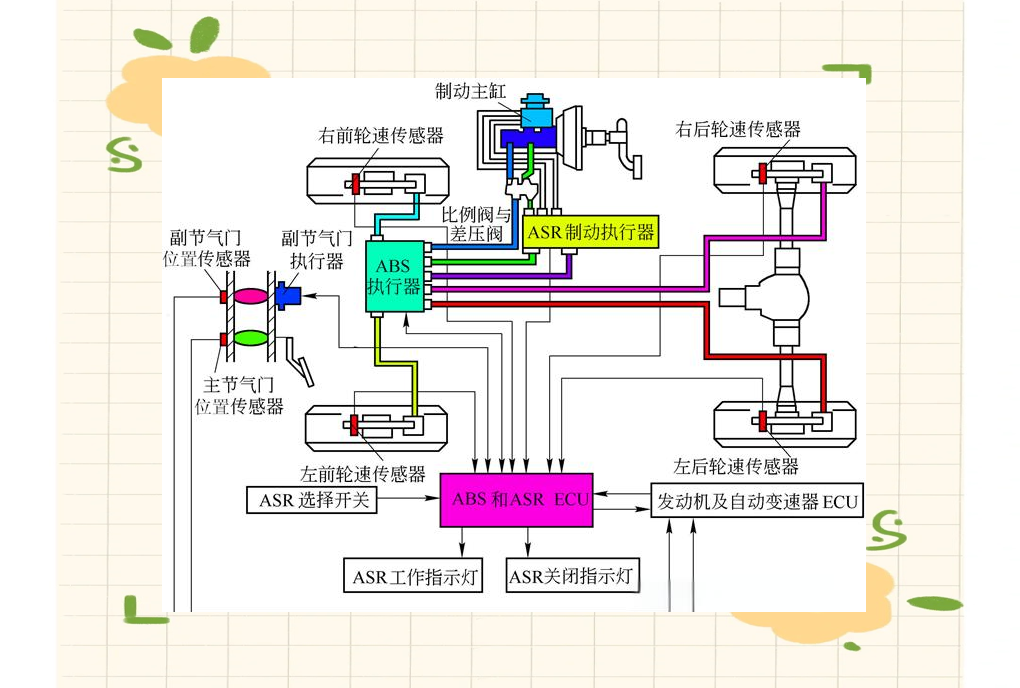 接下来,我们将深入探讨驱动轮防滑转调节系统(ASR)的基本原理。该系统通过监测驱动轮和传动轮的转数来判断驱动轮是否出现滑转现象,并相应地抑制驱动轮转速。它基于ABS系统,共同构成了一套对有滑转趋势的驱动轮进行控制的防滑控制系统。