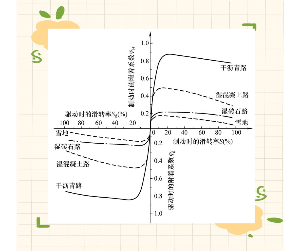 1)附着系数会随着路面性质的不同而产生显著变化。