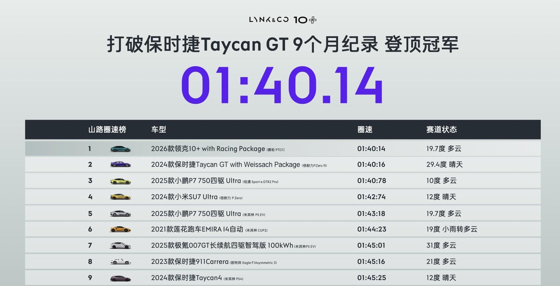 就在昨晚,2026年4月7日,领克搞了个大新闻。他们直接把一辆车拉上了以弯多路险著称的亚洲山脊赛道,然后跑出了1分40秒14的圈速。这个成绩有什么特别的呢?它比保时捷Taycan GT with Weissach Package在山路上跑出的最快纪录,还快了0.02秒。0.02秒,就是眨一下眼的功夫,但就是这微不足道的差距,让领克10+ with Racing Package的名字,被刻在了这条赛道圈速榜的第一位。要知道,保时捷Taycan GT那可是百万级别的电动性能猛兽,在它后面排着的,还有小鹏P7 Ultra+、小米SU7 Ultra这些狠角色。一个中国品牌,用一台预计售价25万上下的车,在赛道上把保时捷给超了,这事儿听起来就够劲爆吧?